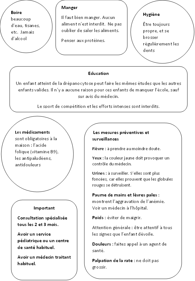 Au regard de ce qui précède, la qualité de vie sera améliorée grâce à un bon suivi médical, psychologique et social régulier. Sur ce, les parents devraient veiller à l’hygiène et à l’alimentation des enfants atteints de la drépanocytose. Ces enfants doivent avoir une bonne hygiène du corps et des dents. Ils doivent également manger une alimentation variée et équilibrée qui contient plus de protéines. Les parents devraient connaitre les facteurs déclenchant des crises douloureuses et anémiques. Les médicaments, tels l’acide folique, les antipaludiques, les antiinflammatoires non stéroïdiens, la pénicilline, la morphine et l’hydroxyurée sont obligatoire à la maison. Ainsi, l’enfant pris en charge n’aura plus de difficultés à aller à l’école et à pratiquer l’éducation physique modérée.