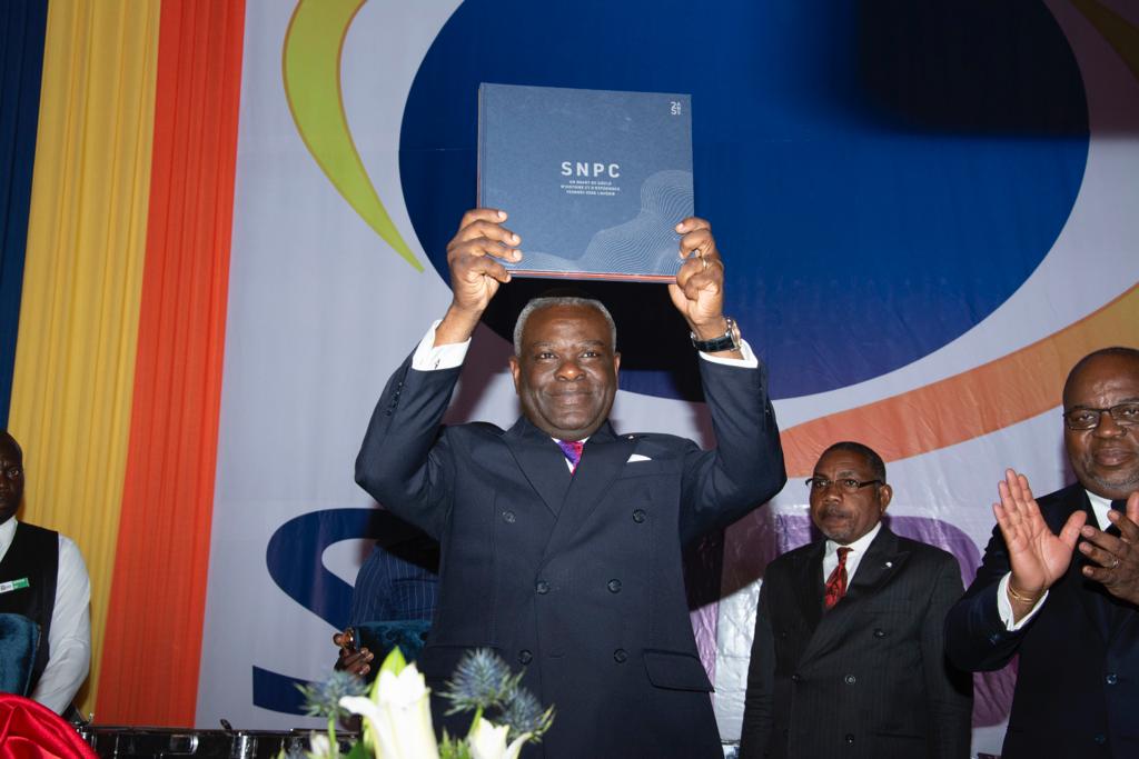 Le Premier Ministre Anatole Collinet Makosso frandissant le Livre de la SNPC