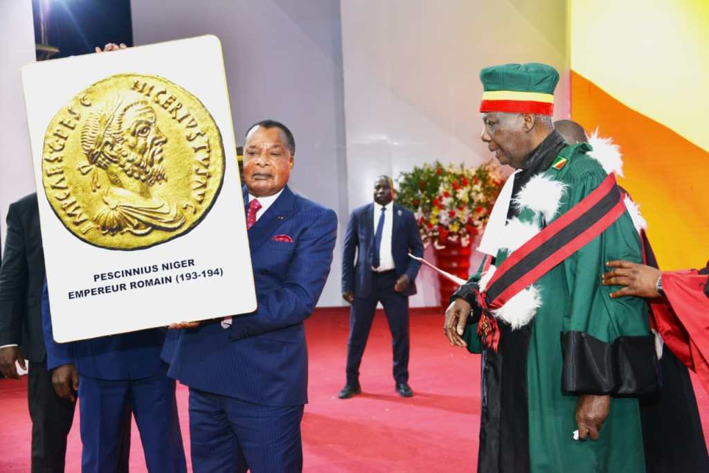De même, le Pr Theophile Obenga , a remis, dans ce qu’il qualifie de don contre don, au Président de la République le tableau de Pescennius Niger, un noir qui fut empereur romain à la fin du 2ème siècle. Cet Empereur Pescennius Niger commandait les Légions romaines les plus nombreuses. Sa voix pouvait s’étendre à plus d’un kilomètre lorsqu’il haranguait les troupes.
